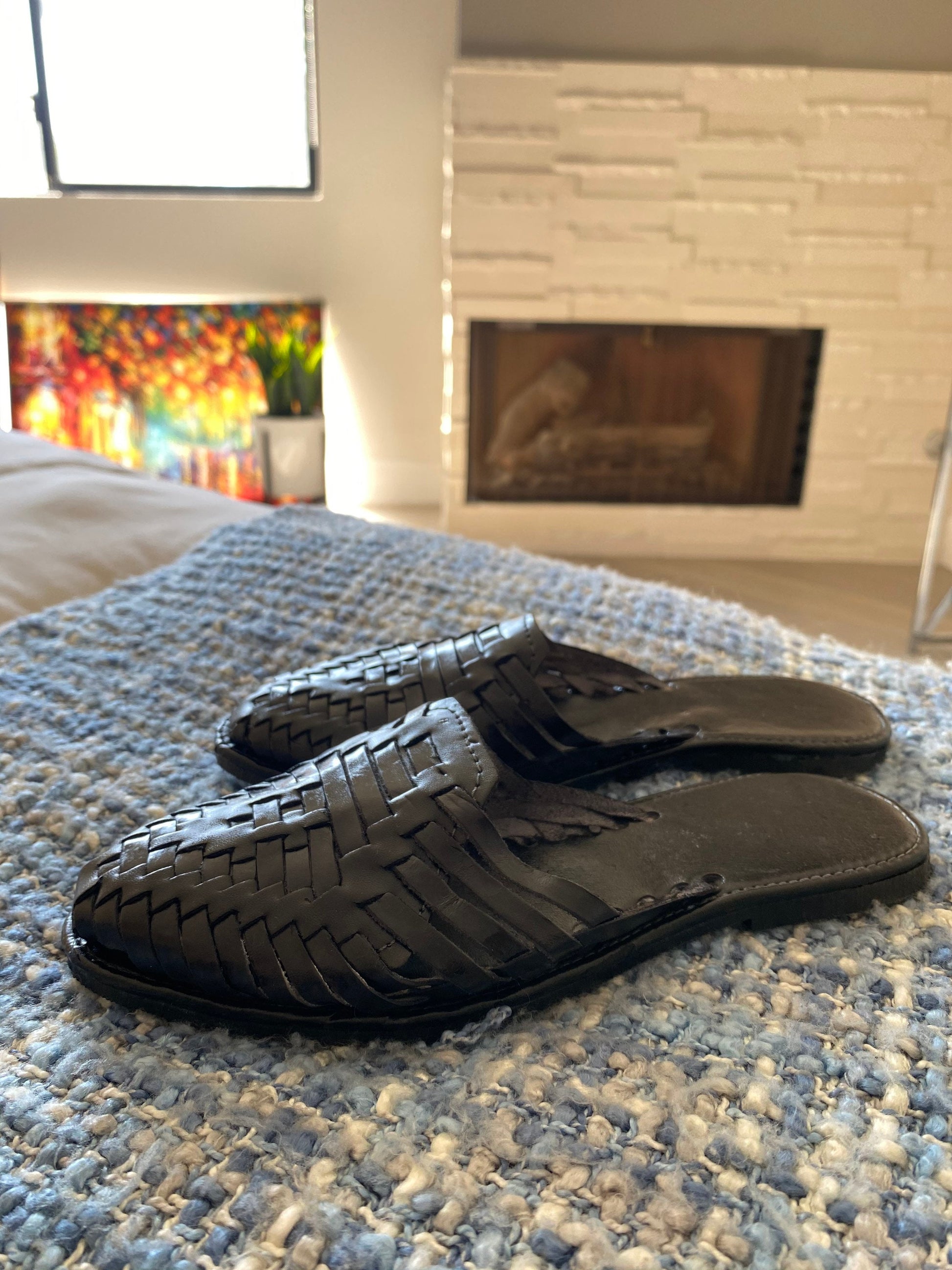 Black Leather Huarache Mules: Mexican Woven Sandals
